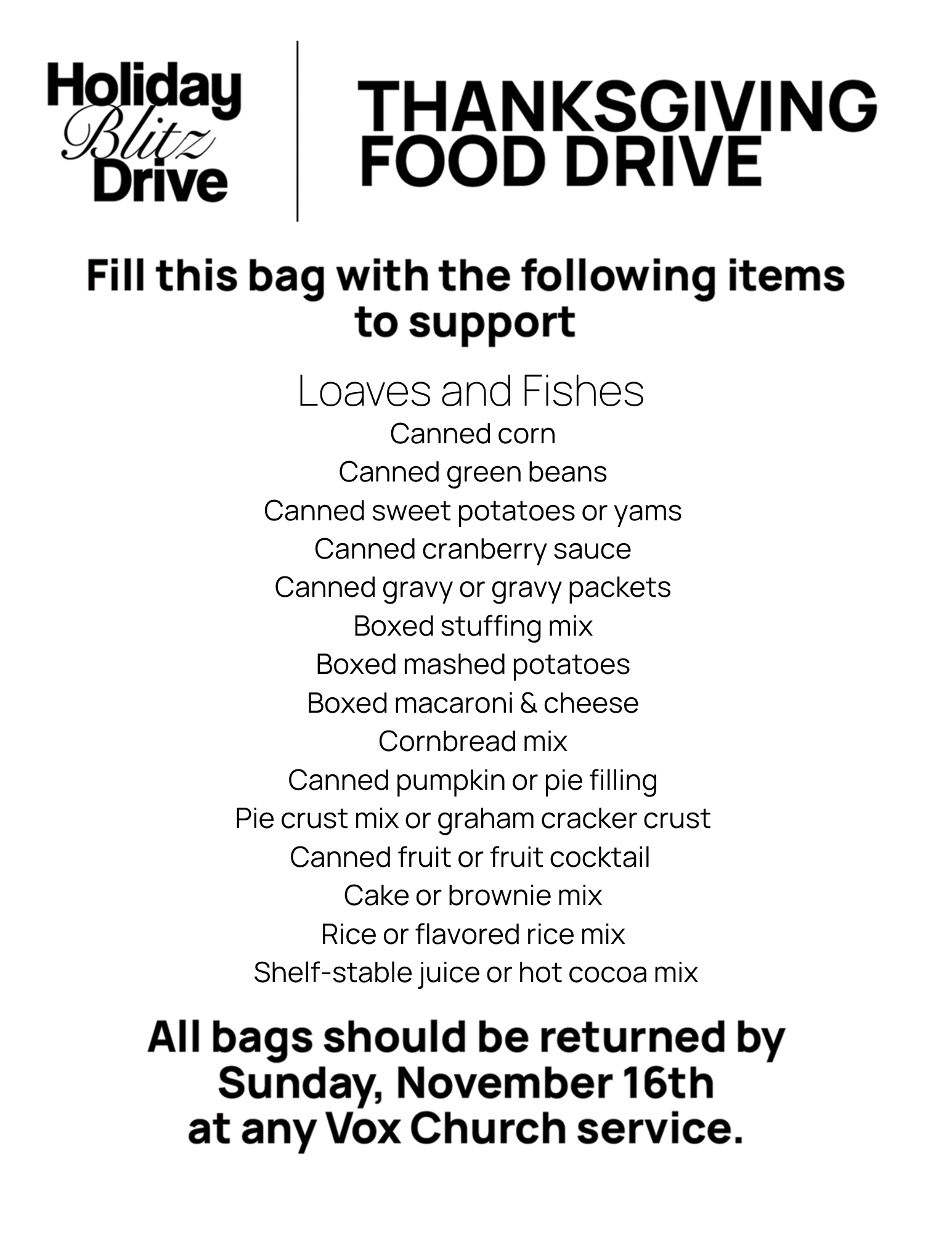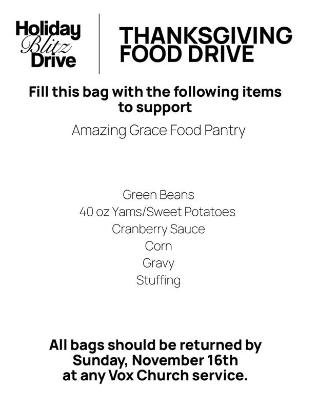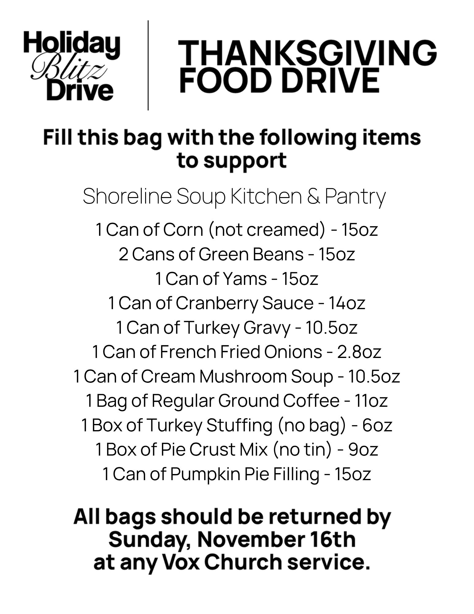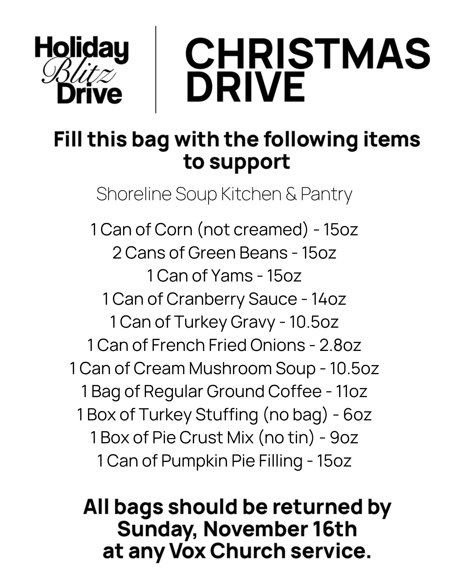 This holiday season, we’re coming together to support families in need through our Holiday Blitz Drive, a tangible expression of Christ’s love during Thanksgiving and Christmas!! From November 2 - November 16, visit any of our campuses to pick-up a black bag with a list of items to purchase for a Thanksgiving meal and a green bag with a gift idea for a family in need.