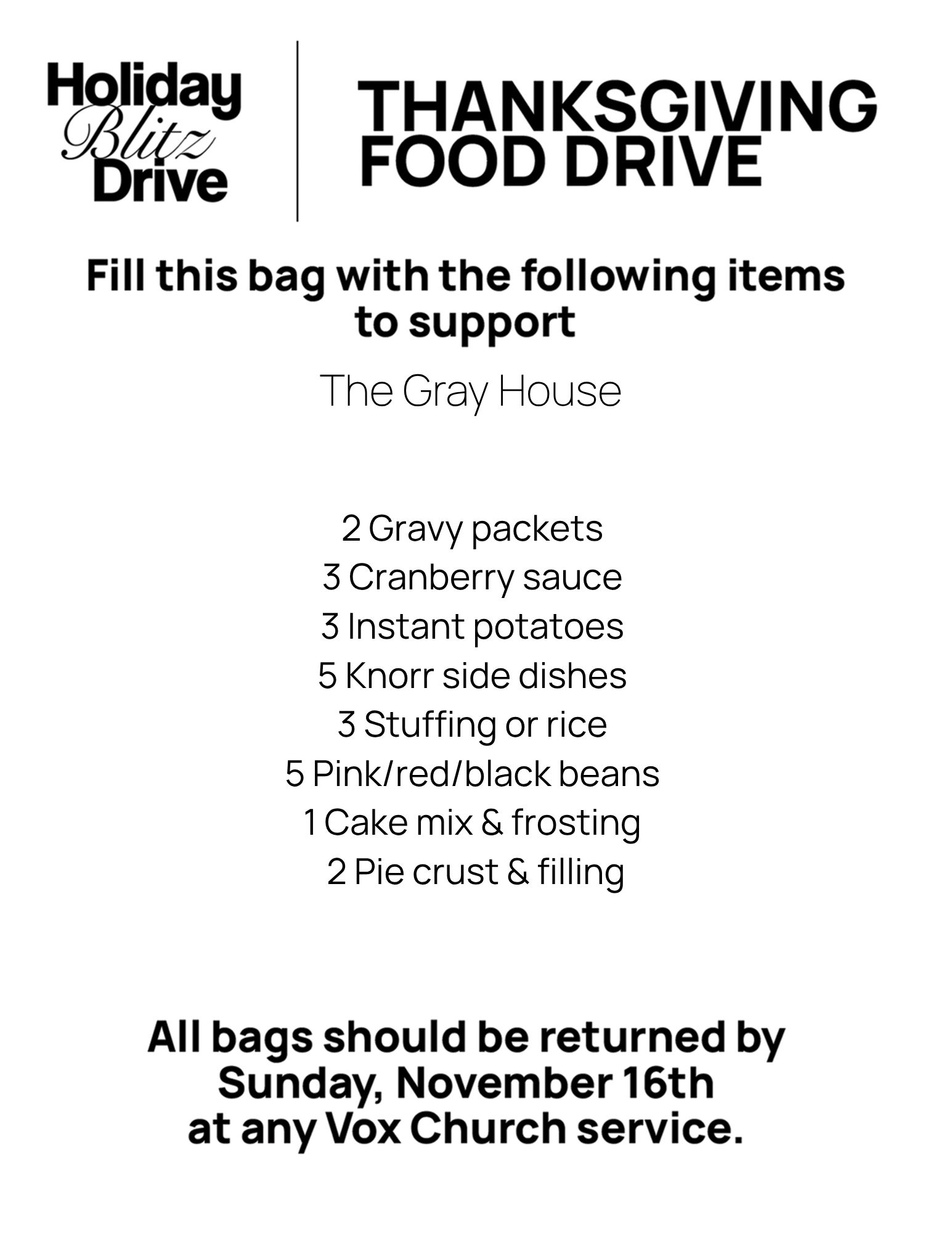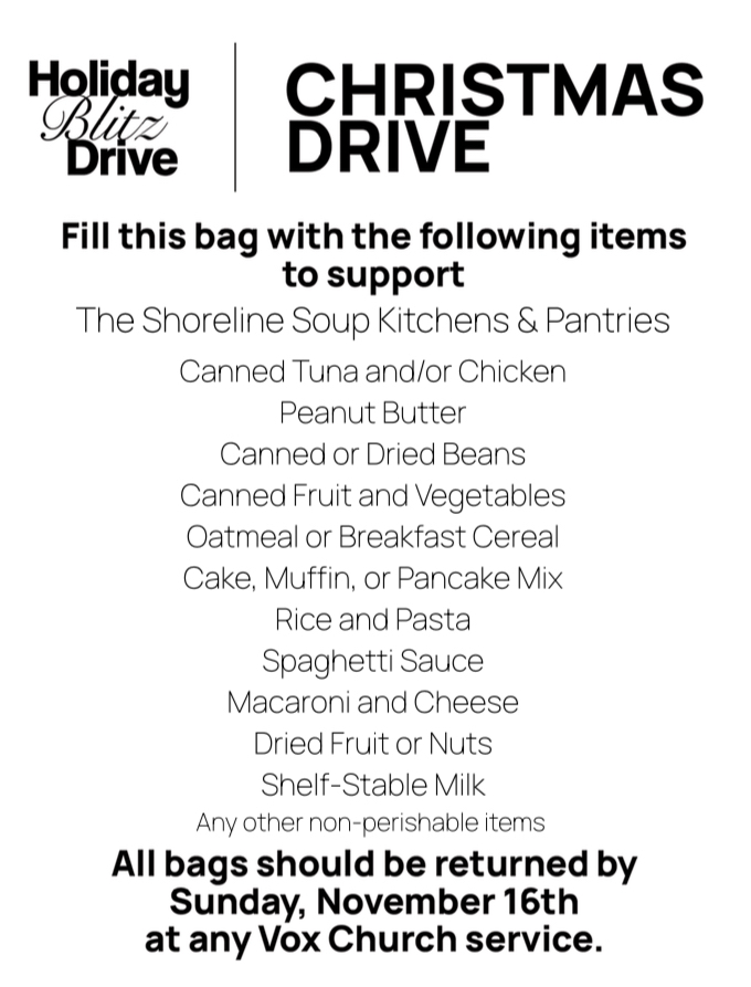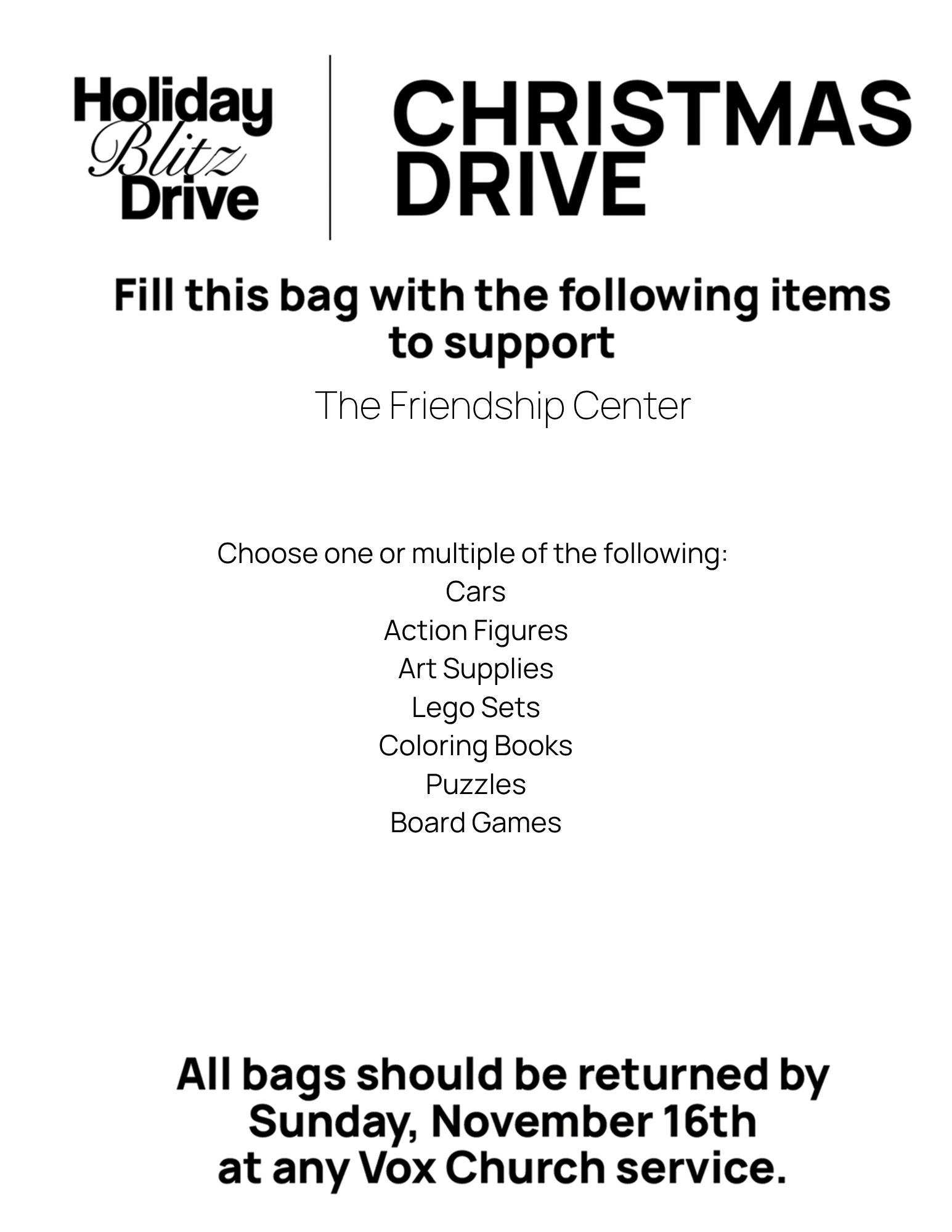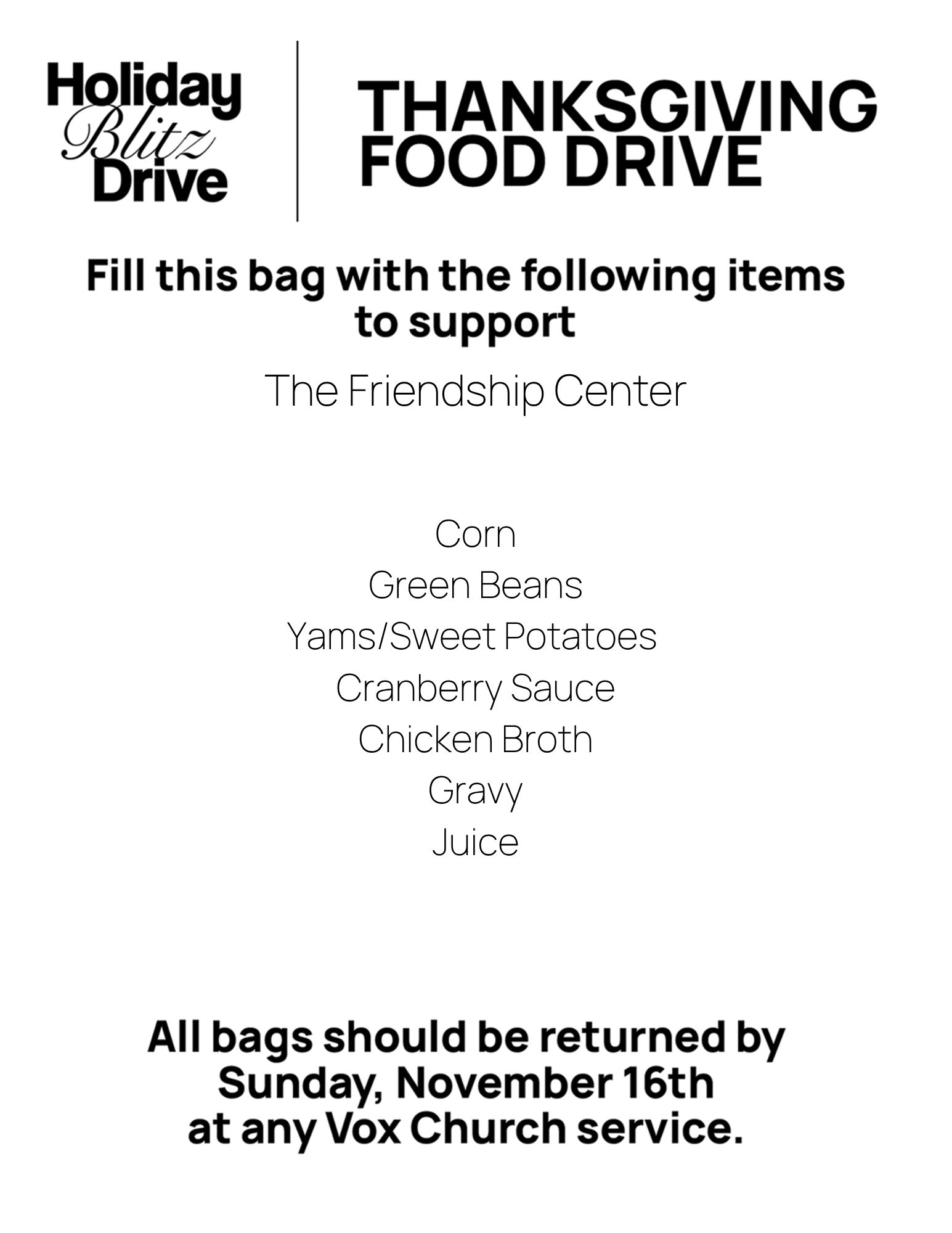 This holiday season, we’re coming together to support families in need through our Holiday Blitz Drive, a tangible expression of Christ’s love during Thanksgiving and Christmas!! From November 2 - November 16, visit any of our campuses to pick-up a black bag with a list of items to purchase for a Thanksgiving meal and a green bag with a gift idea for a family in need.