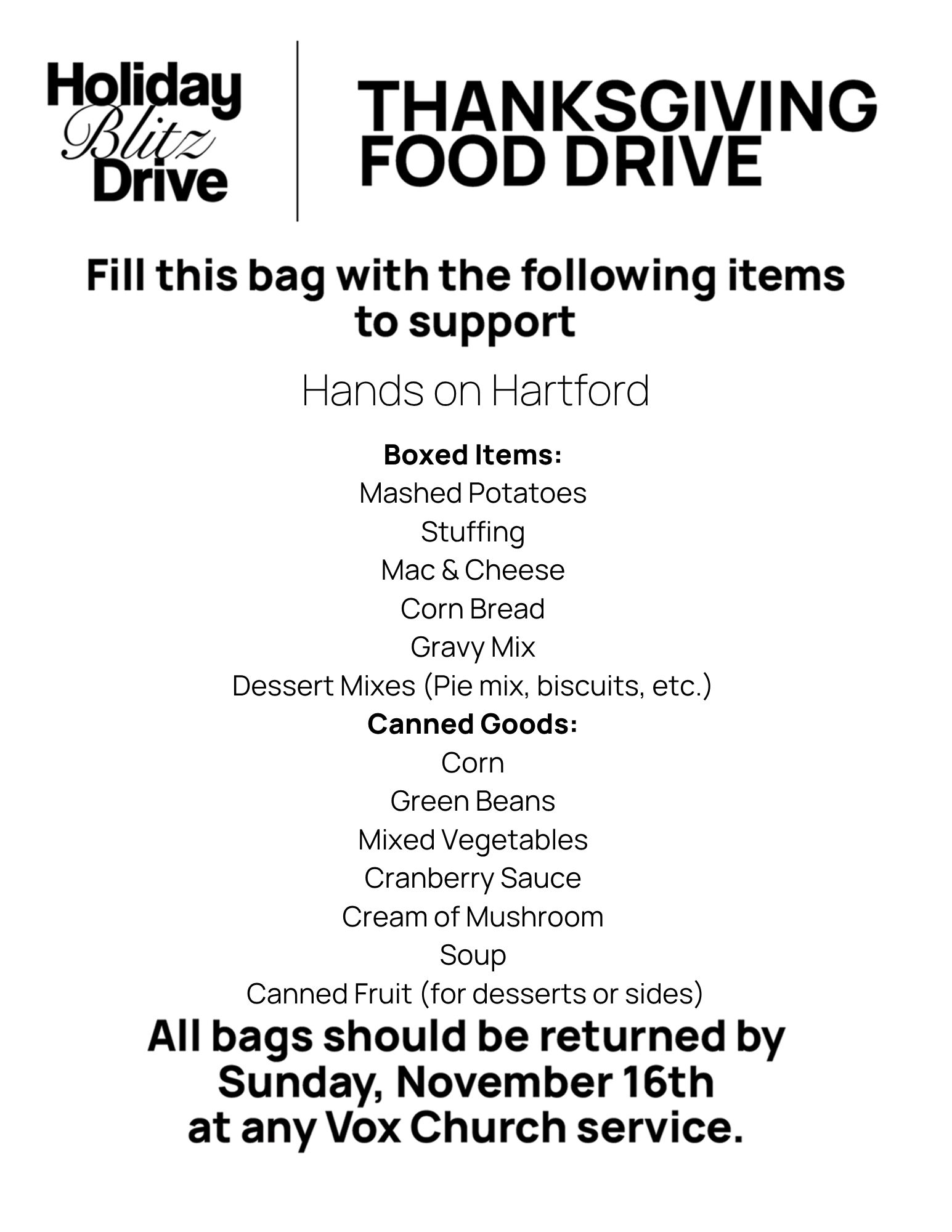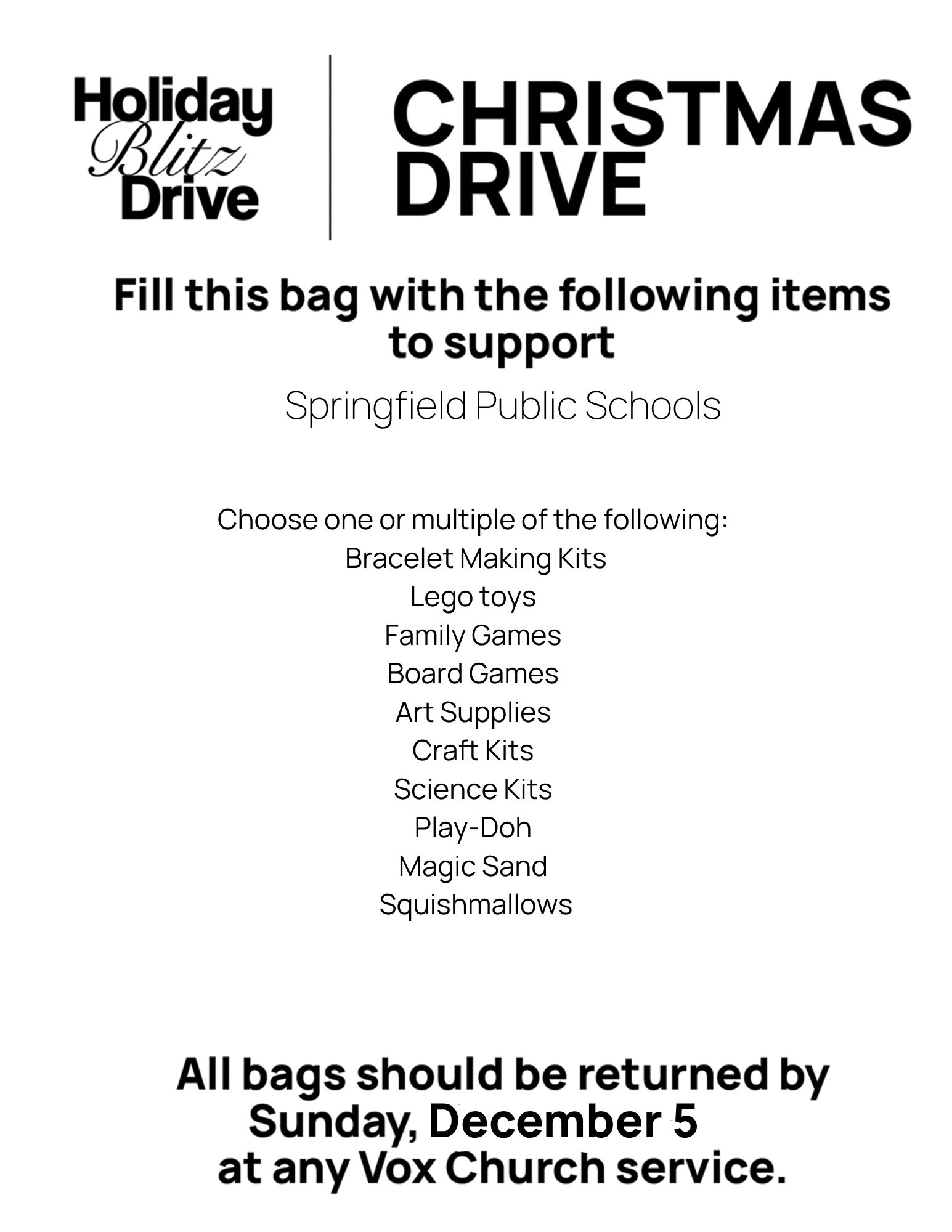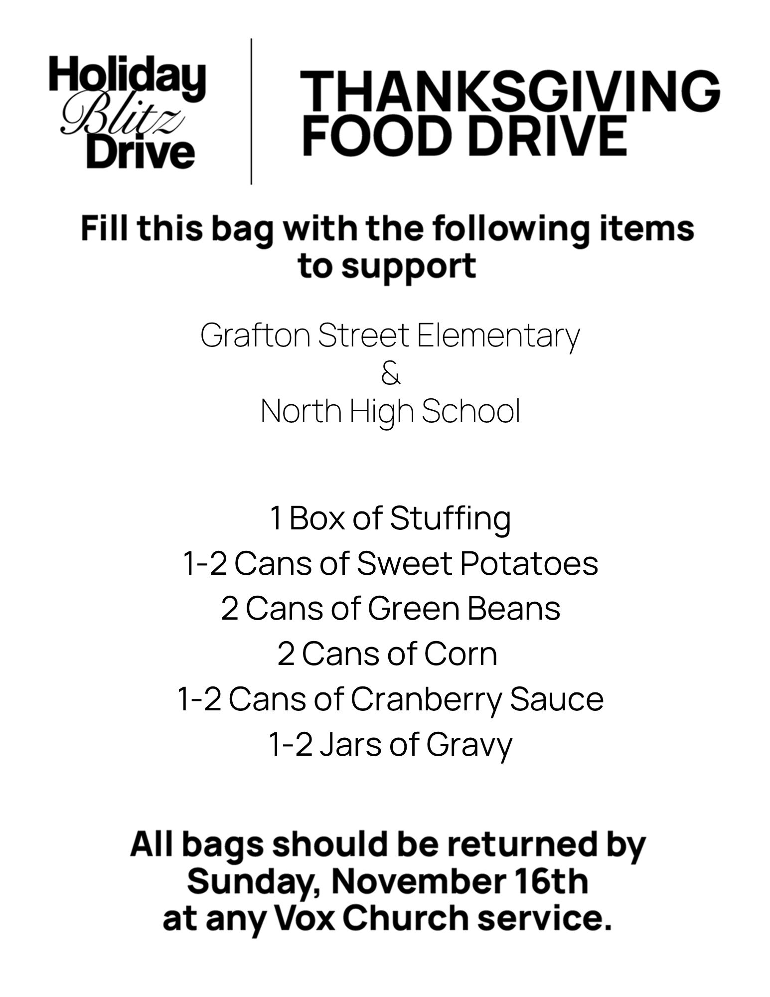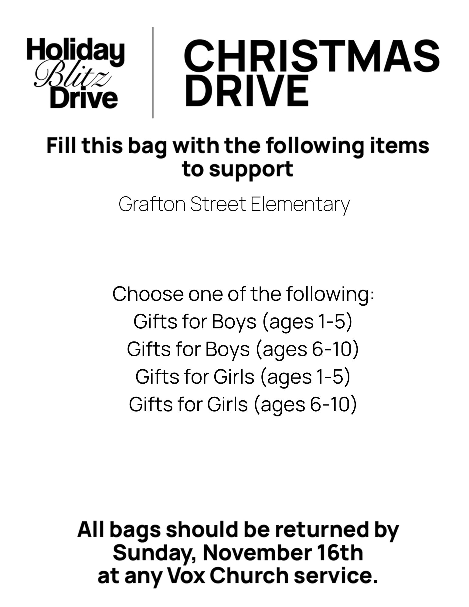 This holiday season, we’re coming together to support families in need through our Holiday Blitz Drive, a tangible expression of Christ’s love during Thanksgiving and Christmas!! From November 2 - November 16, visit any of our campuses to pick-up a black bag with a list of items to purchase for a Thanksgiving meal and a green bag with a gift idea for a family in need.